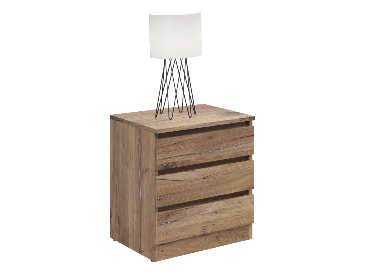 Tres cajones para tener tus libros, auriculares y objetos personales perfectamente organizados junto a la cama. Cuerpo y frente en tablero aglomerado de 16 mm: una construcción sólida y duradera para el uso diario.
