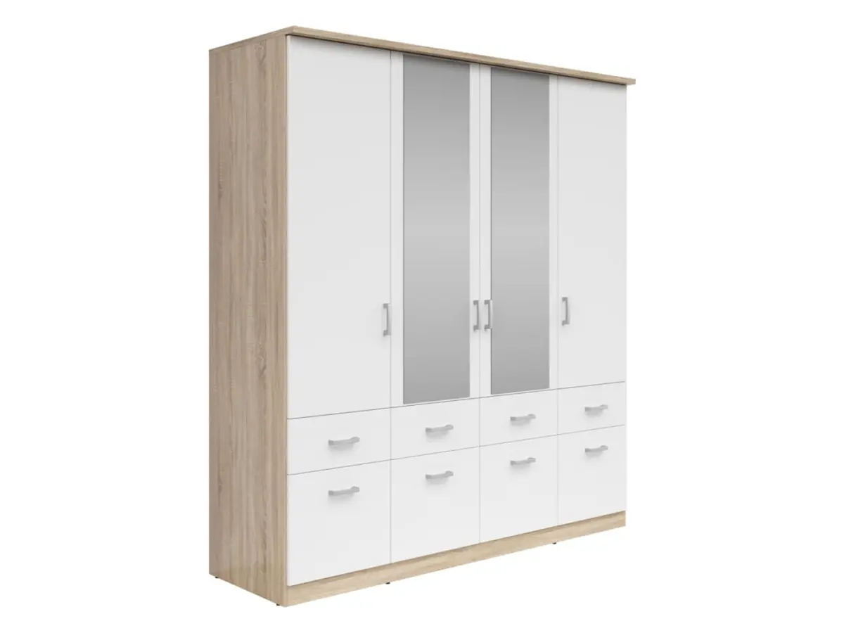 Armario de cuatro puertas Brando-4 181 cm con espejo y cajones blanco/roble sonoma