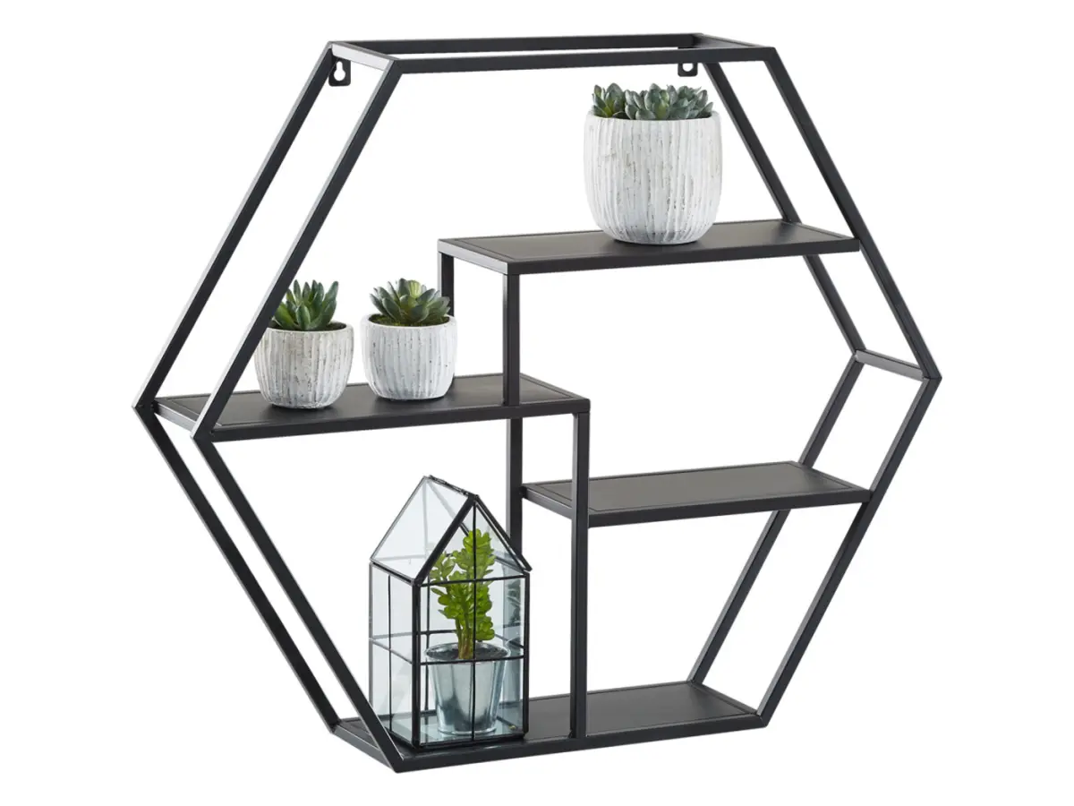 Tres niveles a distintas alturas ofrecen una distribución flexible para crear composiciones con sello propio: cactus y suculentas, figuras, recuerdos de viaje o lo que tú elijas. Puedes colgarla sobre el escritorio, en el salón o en el dormitorio, y renovar la decoración siempre que te apetezca.