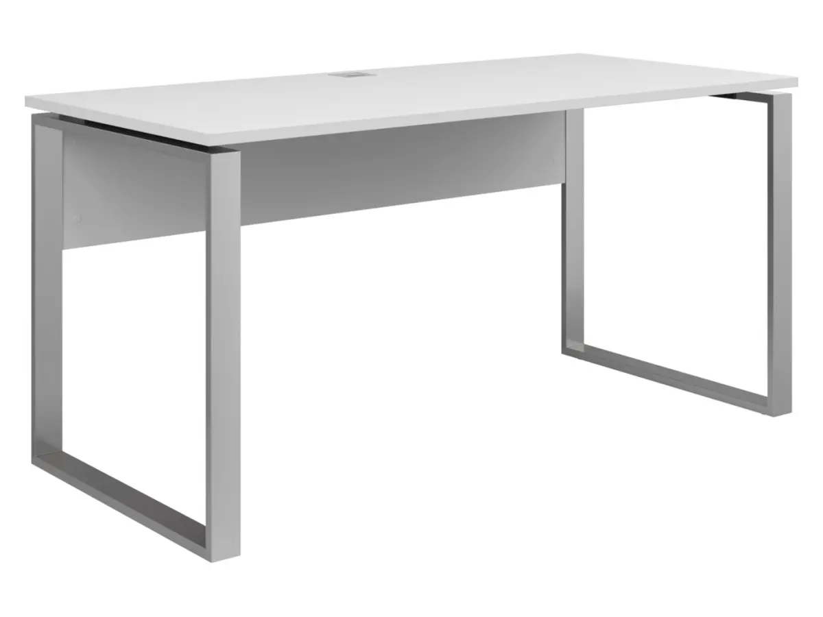 El tablero blanco aporta luminosidad y elegancia a cualquier rincón de trabajo. Las patas metálicas en níquel cepillado añaden un toque industrial que equilibra perfectamente modernidad y sofisticación.