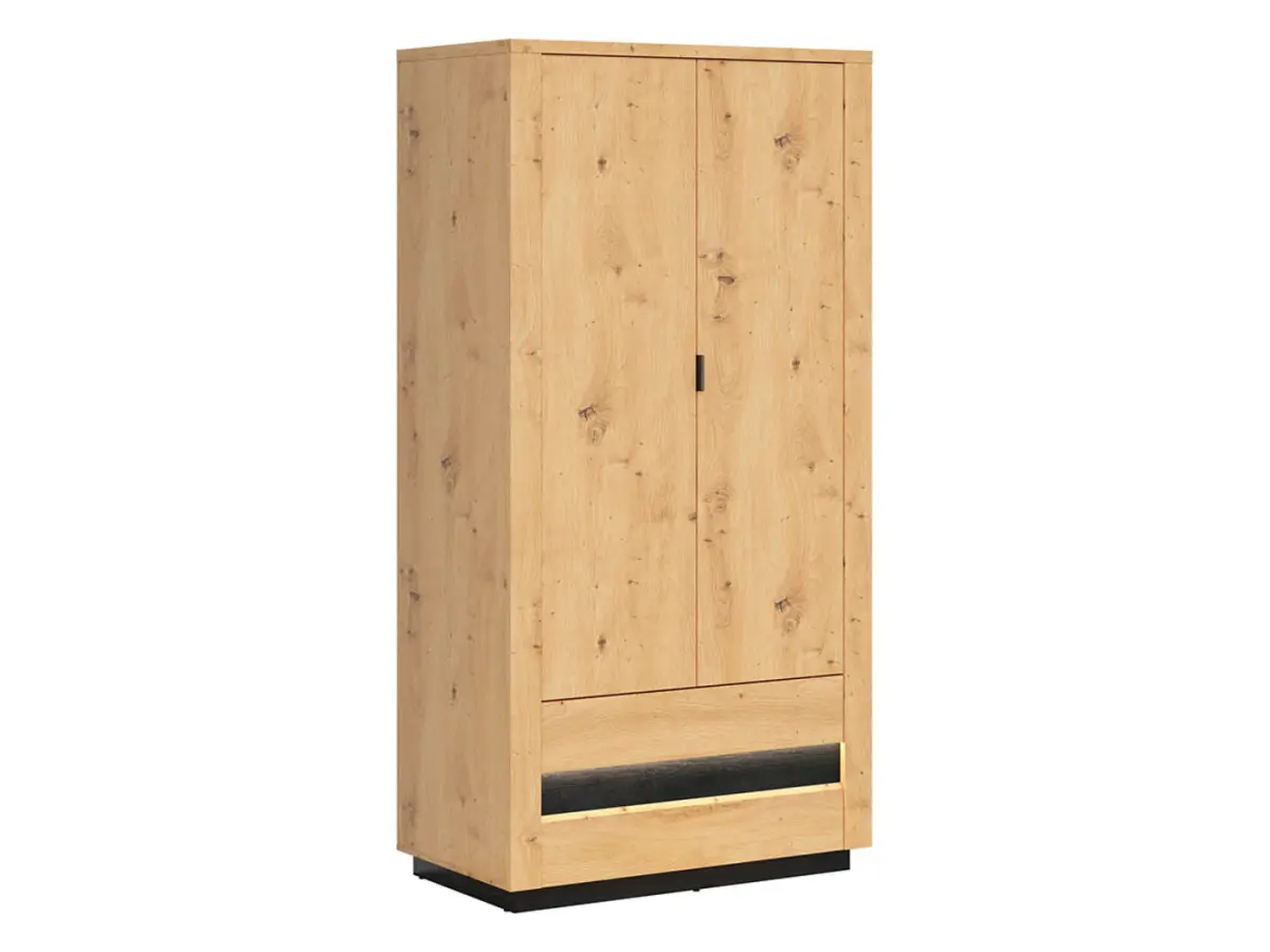 El armario Ostia combina un estilo atemporal con detalles cuidados: laterales reforzados, un listón decorativo en tono «tabla quemada» y una base negra que le otorga carácter y presencia. La cálida tonalidad roble artisan aporta ese toque natural que transforma cualquier estancia.