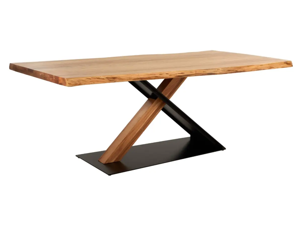 El tablero está fabricado en madera maciza de acacia, una madera de veta rica y bordes irregulares que hacen que cada mesa sea única. No se trata de un patrón repetido ni de un efecto imitado: es la naturaleza misma convertida en mueble.