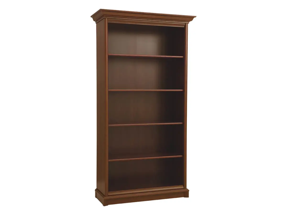 La estantería Kent posee ese carácter atemporal que encaja tanto en un salón moderno como en un estudio clásico. El acabado en chapa de castaño, con su veta cálida y su tono intenso, aporta la calidez de la madera sin renunciar a la elegancia. Los remates tallados en la parte superior son el detalle que marca la diferencia.