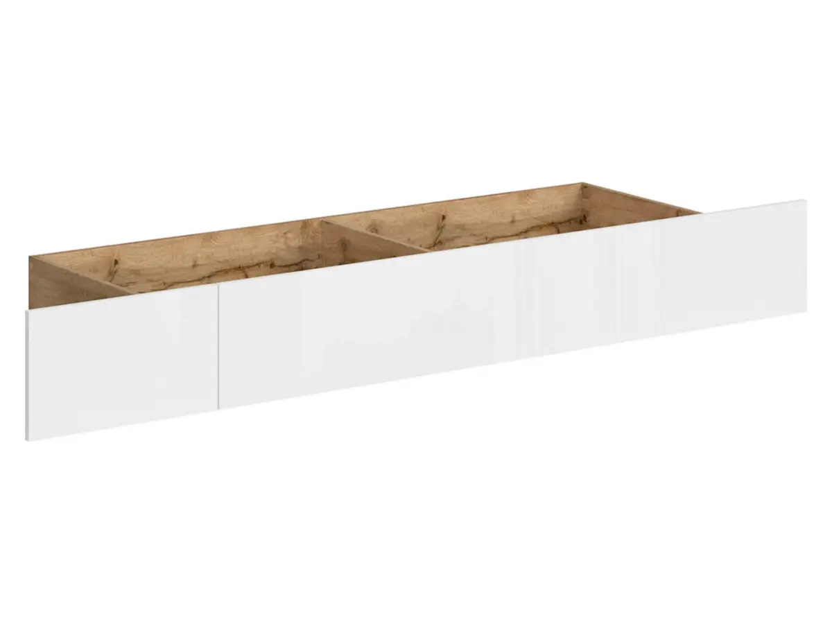 El frontal en blanco brillante efecto espejo sobre una estructura en roble Wotan crea una combinación elegante y versátil. Es el punto de partida perfecto para jugar con colores y texturas en cojines, alfombras y ropa de cama.