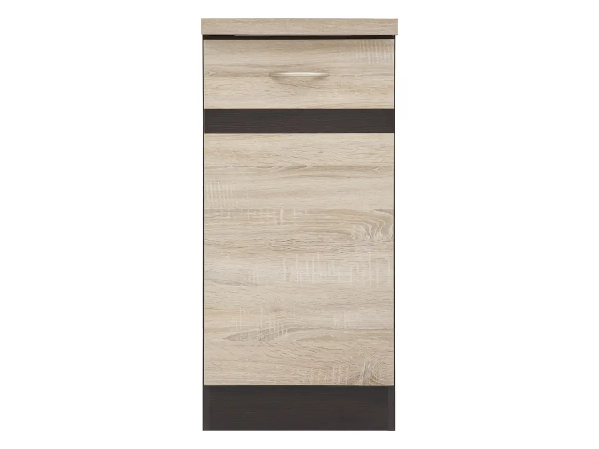 La combinación de la estructura en wengué y el frontal en roble sonoma crea el equilibrio perfecto entre la calidez clásica y la frescura contemporánea. El tirador integrado de diseño limpio remata el conjunto sin estridencias, aportando a tu cocina un carácter propio y coherente.