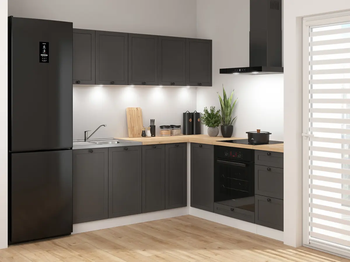 Con sus 200×200 cm, esta cocina en esquina aprovecha al máximo el espacio disponible. Es perfecta para quienes buscan una distribución equilibrada en una cocina de tamaño medio.