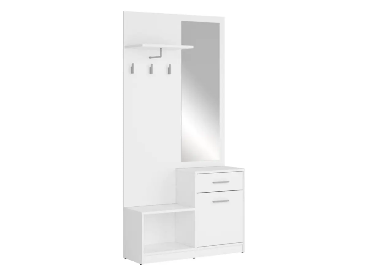 El recibidor Nepo Plus reúne todo lo que necesitas al entrar y salir de casa: zona de colgado, zapatero, cajón, perchas, estante superior y espejo. Una solución completa que convierte incluso los pasillos más estrechos en un espacio ordenado y acogedor.
