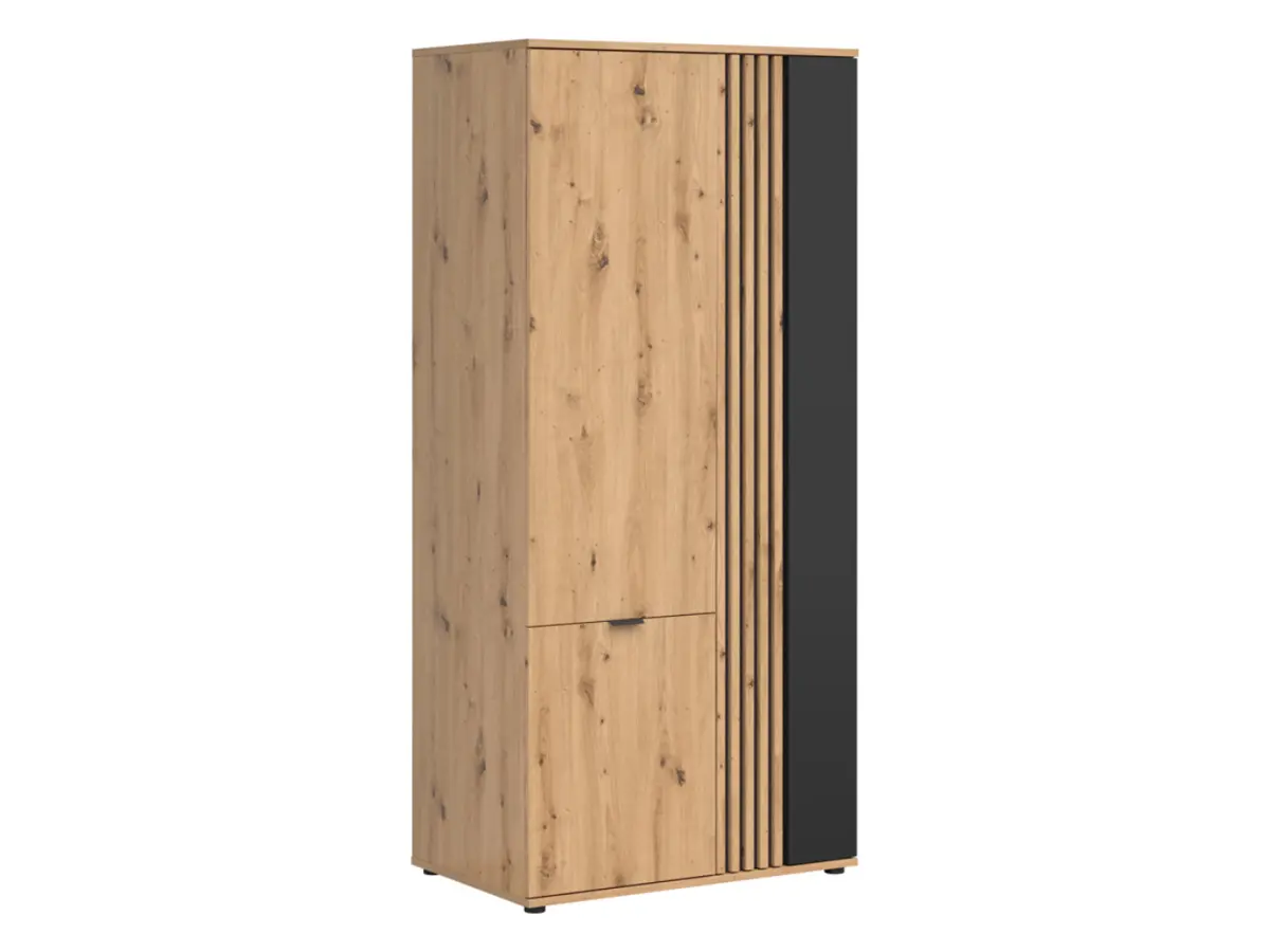 Las lamas decorativas de MDF crean un frontal con relieve tridimensional que convierte este armario en un mueble con personalidad propia. El acabado Roble Artisan imita la calidez de la madera natural, y el toque de negro le aporta ese aire contemporáneo que encaja perfectamente en interiores de estilo industrial y loft.
