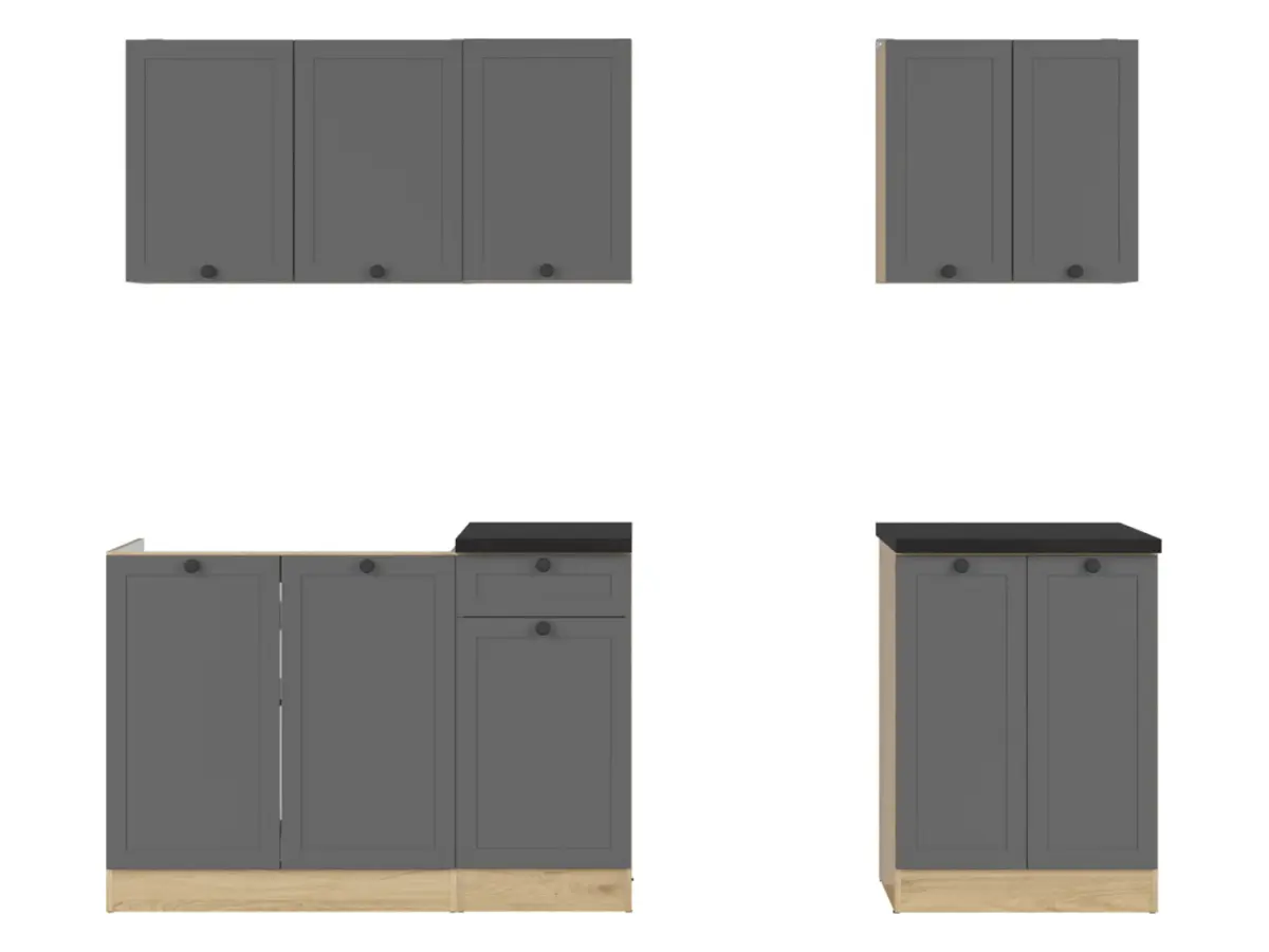 El conjunto incluye módulos altos y bajos diseñados para que cada objeto tenga su lugar. Los armarios superiores son perfectos para vajilla, especias y accesorios; los inferiores ofrecen un espacio generoso para ollas, sartenes y el cubo de basura.