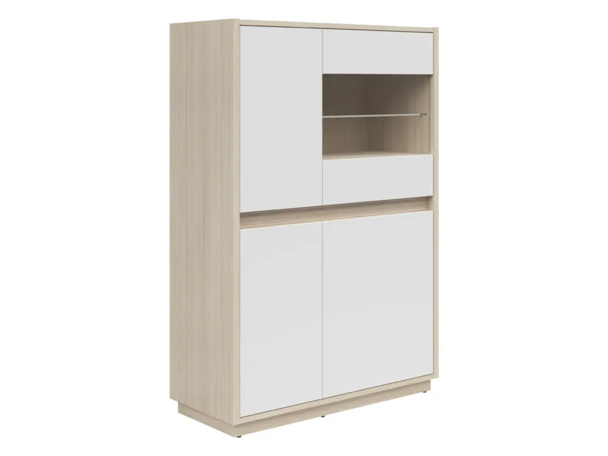 La vitrina Kim ofrece ese equilibrio tan difícil de encontrar: es funcional sin resultar aburrida y elegante sin ser fría. La combinación de roble riva claro con frentes blancos aporta frescura y calidez al mismo tiempo, encajando perfectamente en salones, comedores o estudios de estilo moderno.