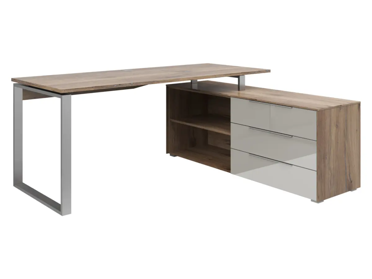 Escritorio de esquina Nevada 158x184 cm con 3 cajones y un estante roble flagstaff oscuro