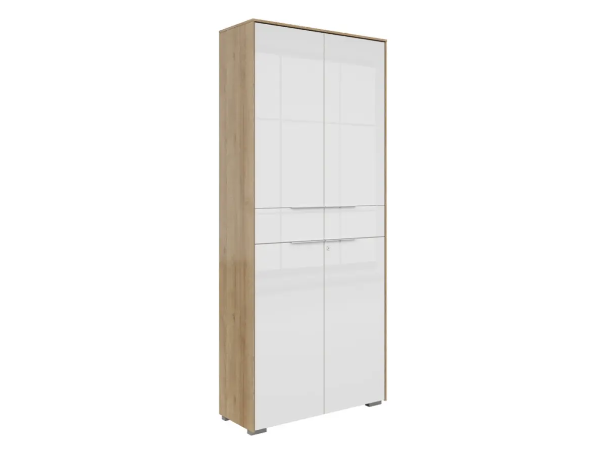 La estantería Nevada combina una estructura de roble Riviera con puertas de cristal templado lacado en blanco: una mezcla de calidez natural y líneas limpias que encaja a la perfección en cualquier oficina moderna o estudio.
