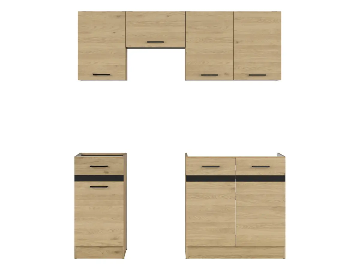 Con 170 cm de ancho, este conjunto es la solución completa para una cocina pequeña o puede integrarse fácilmente en un espacio mayor. Un tamaño versátil que se adapta a distintas distribuciones sin complicaciones.