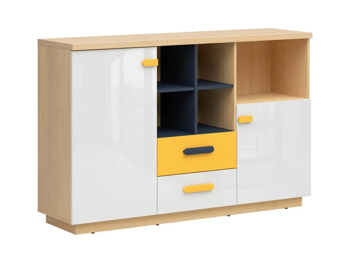Cómoda Wesker 150 cm con 2 puertas 2 cajones y estantes roble polaco/uni azul marino/blanco brillo/amarillo