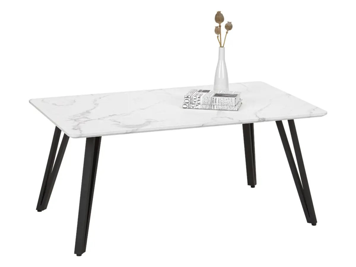 El tablero blanco con efecto mármol aporta una elegancia serena al salón, con vetas suaves que imitan la piedra natural y hacen que cada pieza luzca única. Las patas negras en diagonal crean una composición geométrica que llama la atención y encaja perfectamente en interiores modernos, escandinavos y minimalistas. El contraste entre el blanco y el negro es atemporal: combina bien tanto en espacios claros como en ambientes más oscuros.