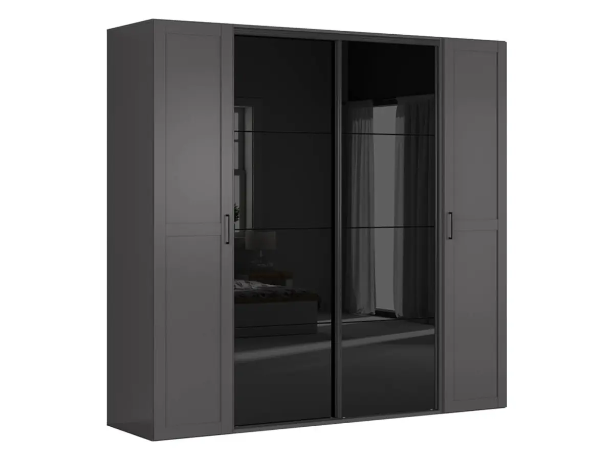 El conjunto Flex combina puertas correderas en negro brillante con un cuerpo en grafito y dos puertas abatibles del mismo tono. Los tiradores rectos en negro rematan el conjunto con una elegancia sobria y moderna: una pieza que renueva el dormitorio o el pasillo al instante.