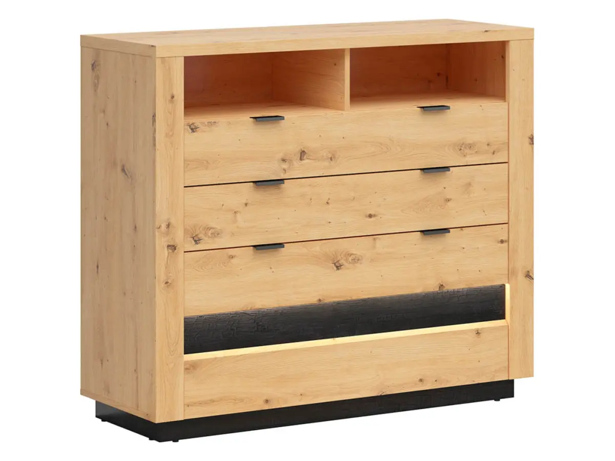 La cómoda Ostia posee una presencia difícil de ignorar. Sus laterales de gran grosor le otorgan solidez visual, mientras que el acabado roble artisan aporta calidez natural. La moldura decorativa en tono madera quemada y la iluminación LED integrada crean un contraste elegante, rematado por una base negra con carácter.