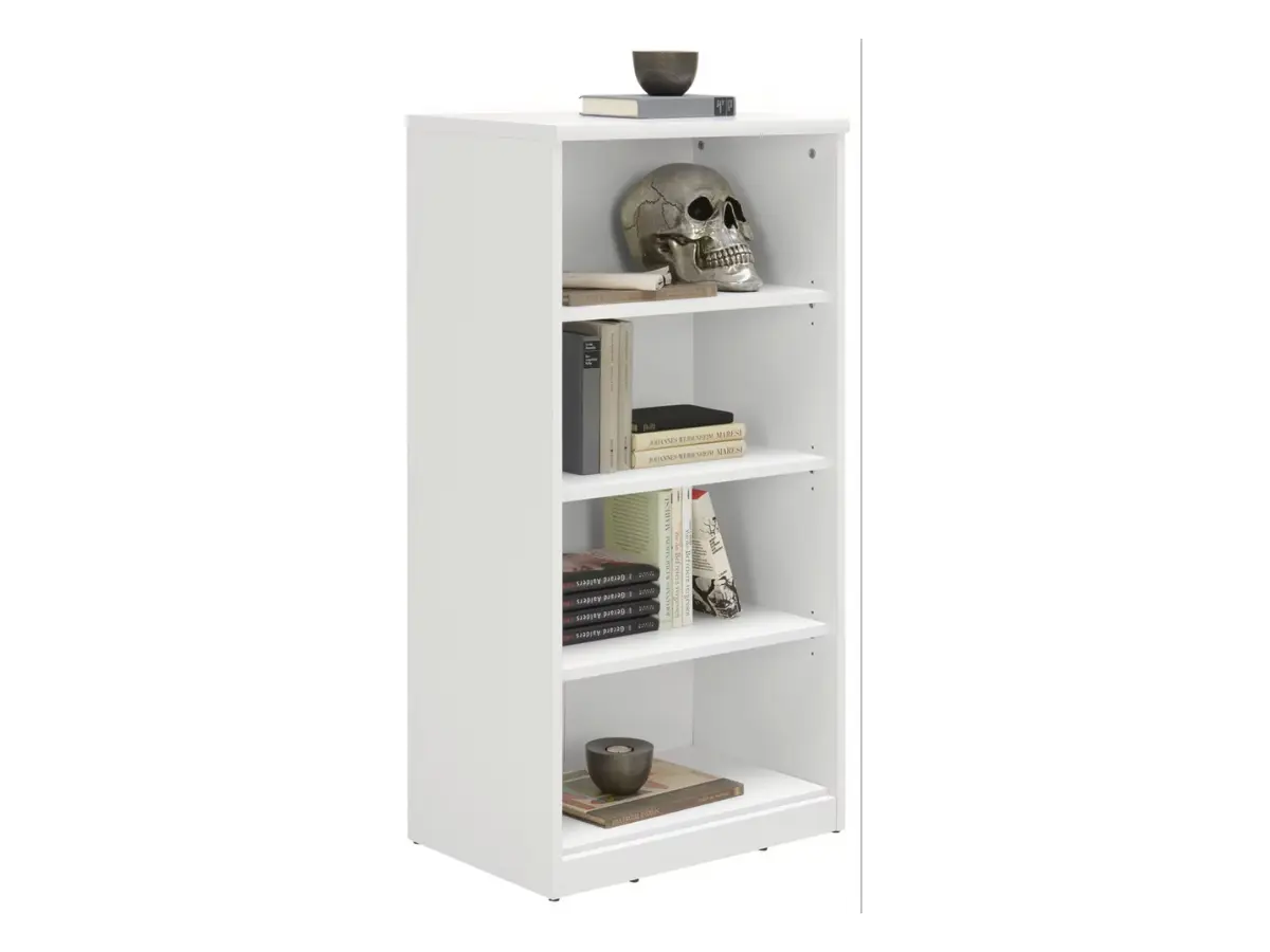 El blanco puro de la estantería Easy armoniza con casi cualquier estilo, desde el clásico hasta el más contemporáneo. Sus líneas limpias y su anchura de aproximadamente 55 cm le otorgan un aspecto moderno sin ocupar más espacio del necesario.