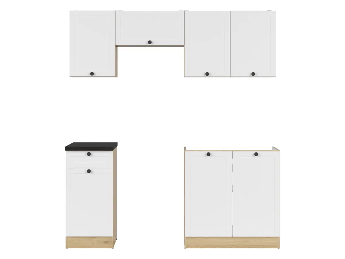 La colección Junona Line combina cuerpos en tono roble Bernstein con frentes blancos enmarcados, creando un equilibrio cálido entre lo clásico y lo contemporáneo. Los tiradores tradicionales y la encimera en color pizarra metálica negro-dorado completan un conjunto tan estético como funcional.