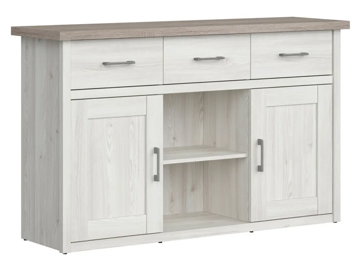 Para quienes buscan optimizar el espacio, esta cómoda es una solución práctica y bien pensada: sus 2 armarios, 3 cajones y 2 huecos abiertos permiten mantener documentos, material de oficina y objetos personales perfectamente organizados. El amplio tablero superior invita a colocar fotos familiares, un jarrón con flores o tus piezas decorativas favoritas.
