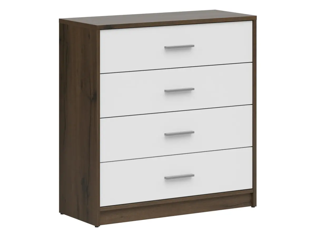 La cómoda Nepo Plus combina frentes lisos en blanco con una estructura en color roble noble, creando un equilibrio entre calidez y modernidad perfecto para dormitorios juveniles. Su tirador horizontal recorre los cajones, aportando un detalle sencillo y elegante que rompe la uniformidad.