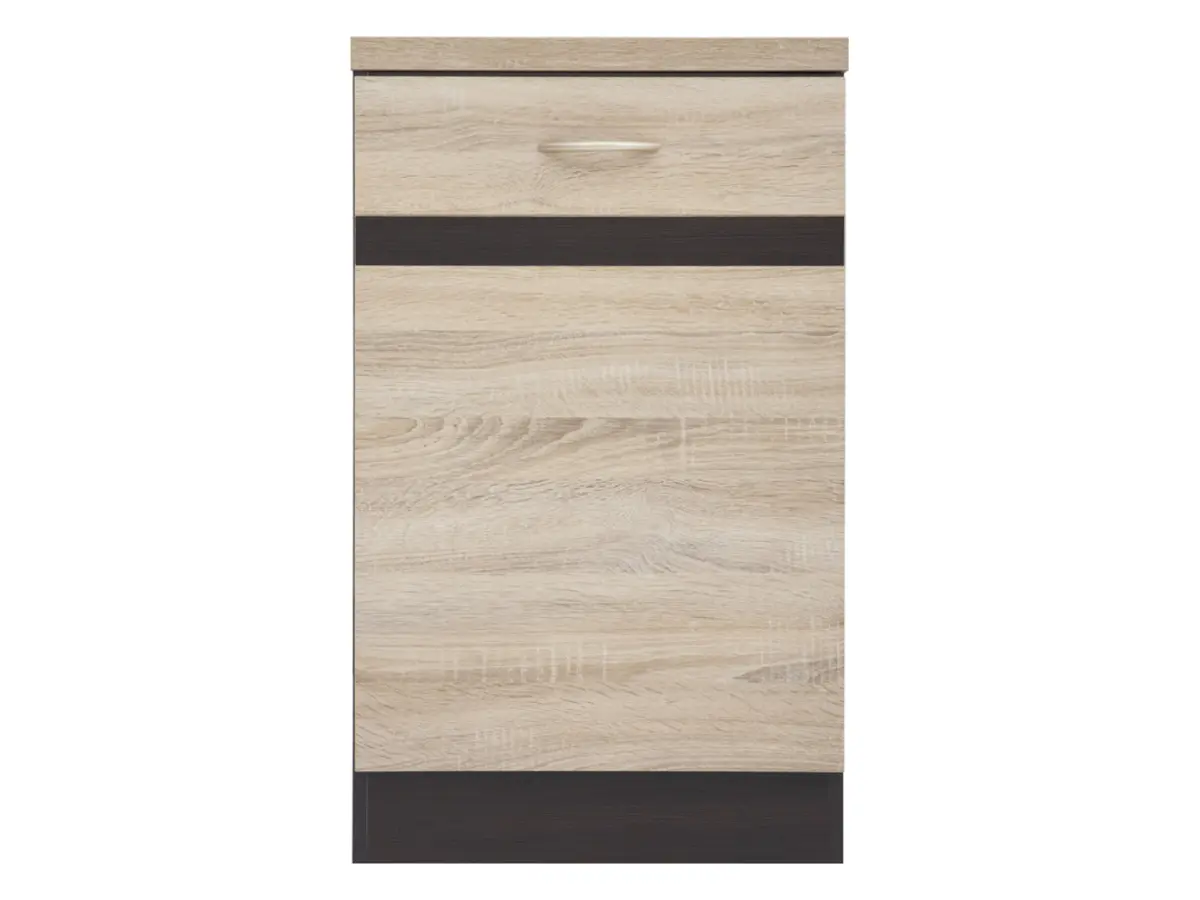 La combinación de la estructura en color wengué y el frente en roble sonoma crea un equilibrio perfecto entre calidez y modernidad. El tirador integrado de diseño limpio remata el conjunto aportando carácter a cualquier cocina.