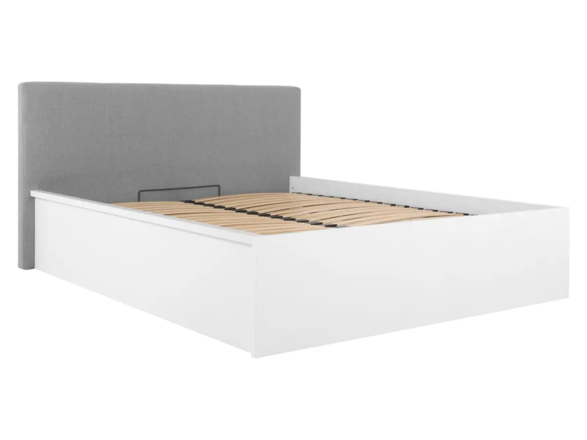 La cama Tetrix combina un elegante armazón en blanco brillo con un cabecero tapizado en gris, una combinación que transmite modernidad y serenidad al mismo tiempo. Sus laterales de mayor grosor le otorgan una presencia sólida y visualmente imponente, convirtiéndola en la pieza central ideal para el dormitorio.