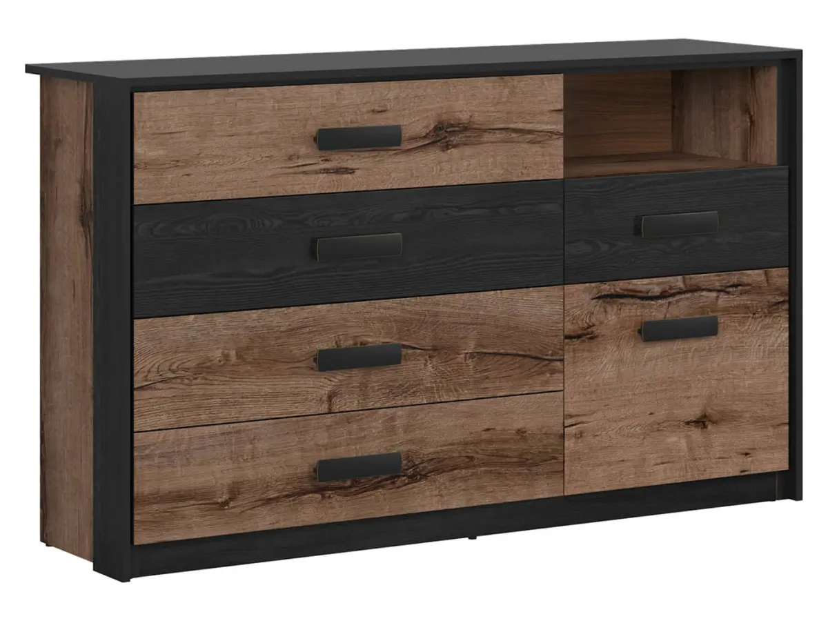 La cómoda Kassel combina el cálido tono roble monastery con frentes en roble negro, creando un contraste elegante y sofisticado. Sus líneas limpias y proporciones equilibradas encajan a la perfección en dormitorios de estilo moderno.