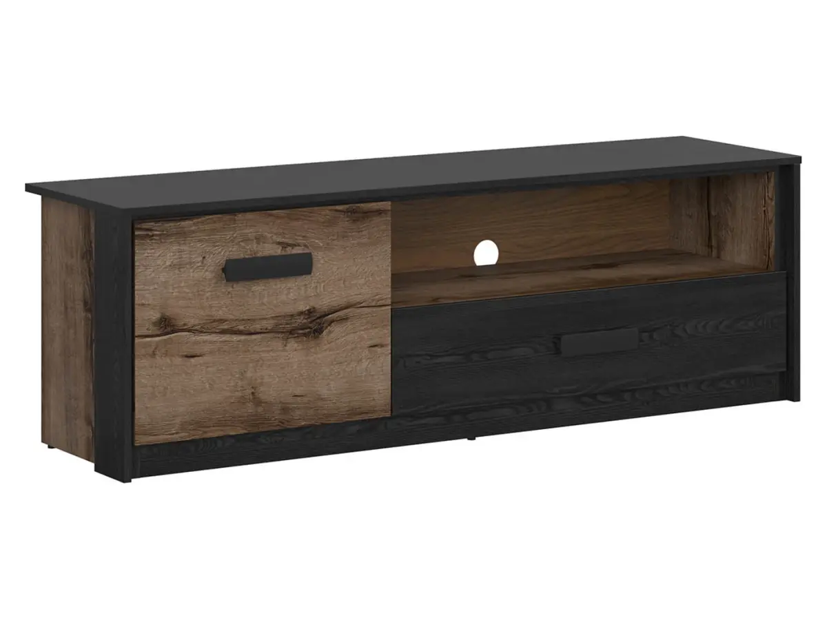 El mueble Kassel combina dos tonos que se complementan a la perfección: el cálido roble monastery y el sofisticado roble negro. La veta natural de la madera aporta calidez y carácter, mientras que el contraste oscuro le otorga un toque contemporáneo. Una combinación ideal para interiores modernos o con estética tipo loft.