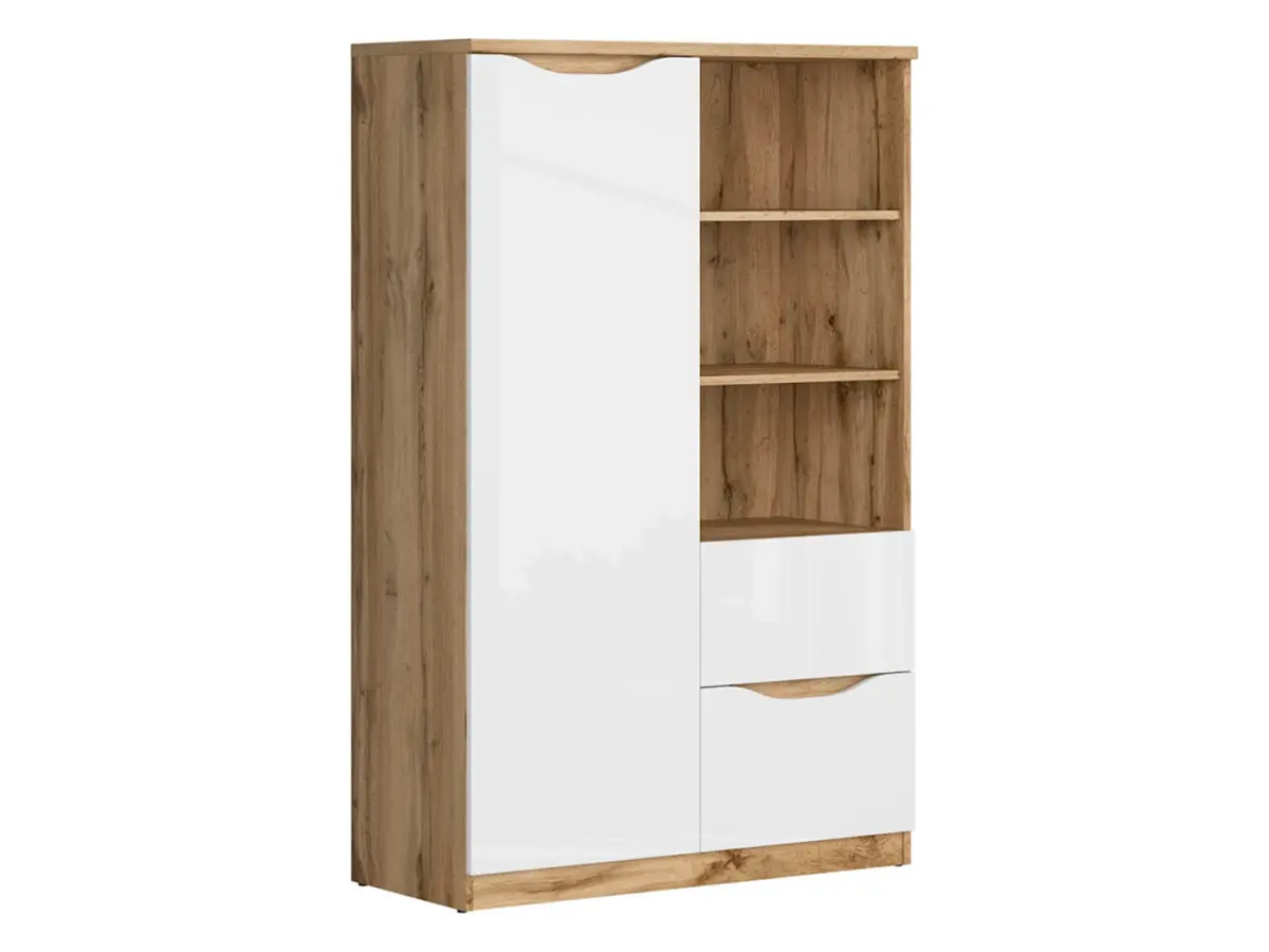 La estructura en color roble Wotan contrasta con los frontales laminados en blanco brillante con efecto espejo, creando un diseño moderno y atemporal que evoluciona con los gustos del joven. El listón decorativo está disponible en dos acabados —blanco o roble Wotan— para personalizar el mueble.