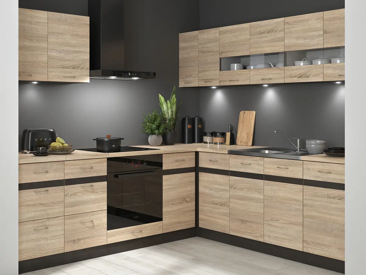 Un conjunto de cocina en esquina de 220×240 cm, listo para transformar tu espacio. El cuerpo en wengué combina a la perfección con los frentes en roble sonoma para un resultado cálido y consistente.