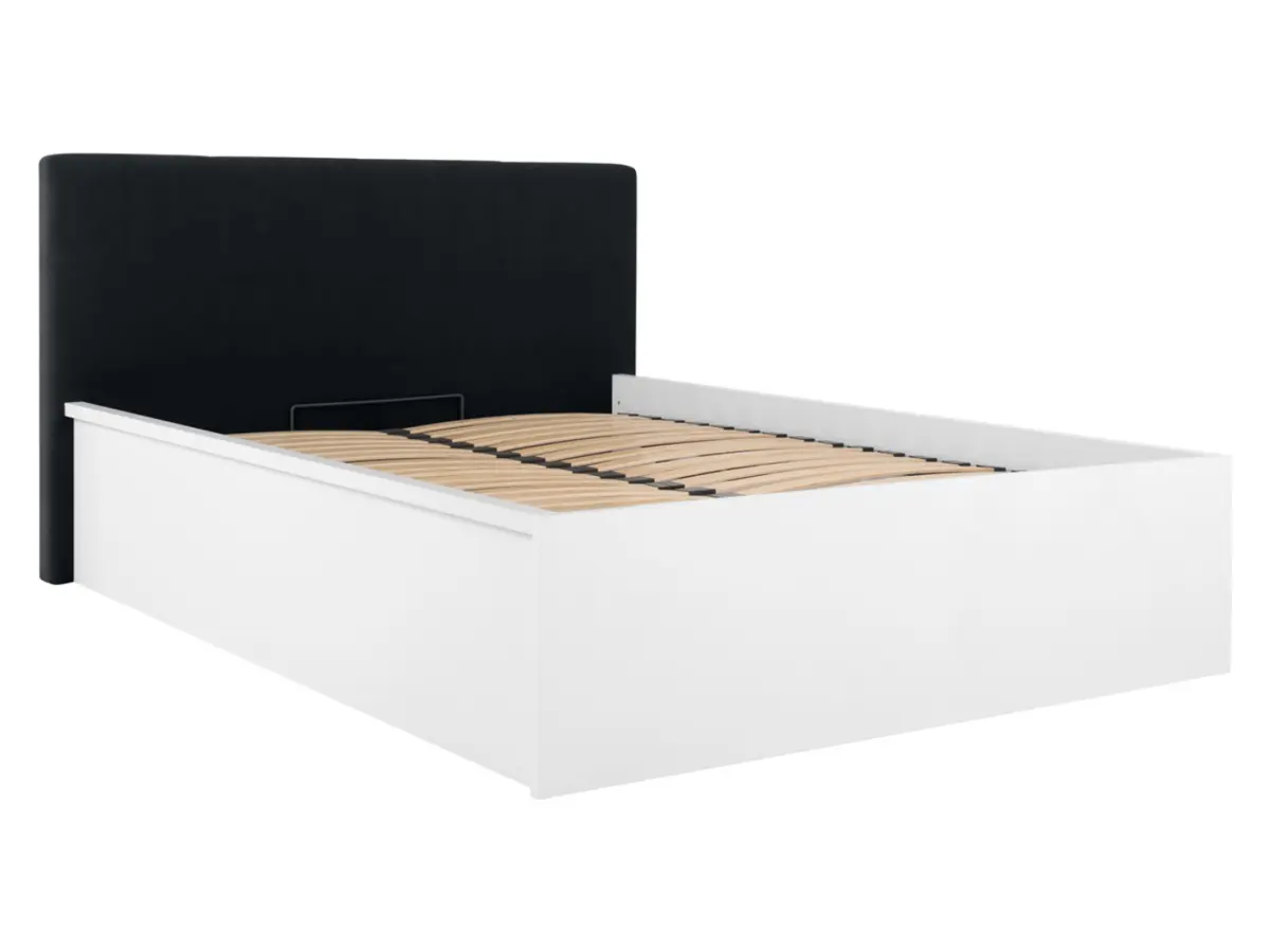 La cama Tetrix combina una estructura en blanco brillo con un cabecero tapizado en negro: un contraste elegante que aporta carácter a cualquier dormitorio. Los laterales reforzados subrayan su construcción sólida y visualmente imponente.