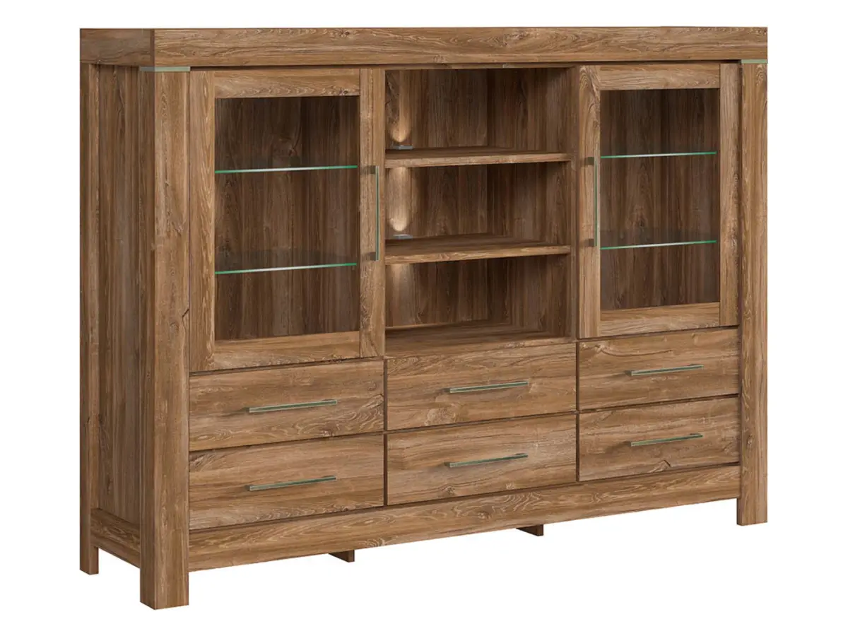 Cómoda Gent 166 cm vitrina con 2 puertas 6 cajones y 3 estantes roble stirling