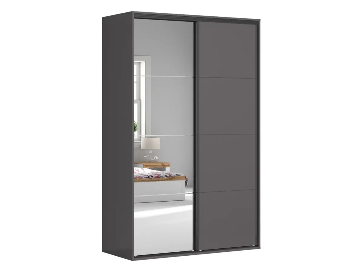 El armario Flex combina dos mundos en un solo mueble: una puerta con un gran espejo que amplía visualmente la estancia y otra con acabado en grafito que aporta calidez y carácter. El cuerpo y el interior en tono gris lino crean un conjunto armonioso que encaja tanto en ambientes modernos como clásicos.