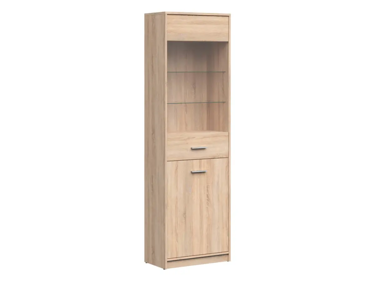 La vitrina se divide en dos secciones que se abren de forma independiente. La parte superior, con frente de cristal, alberga tres estantes ideales para lucir tu colección favorita: tazas, trofeos u objetos especiales. Detrás de una puerta opaca, cuenta con dos compartimentos discretos para el día a día. En la parte inferior, un amplio armario con estante divisorio permite organizar desde juegos de mesa hasta archivadores o vajilla.