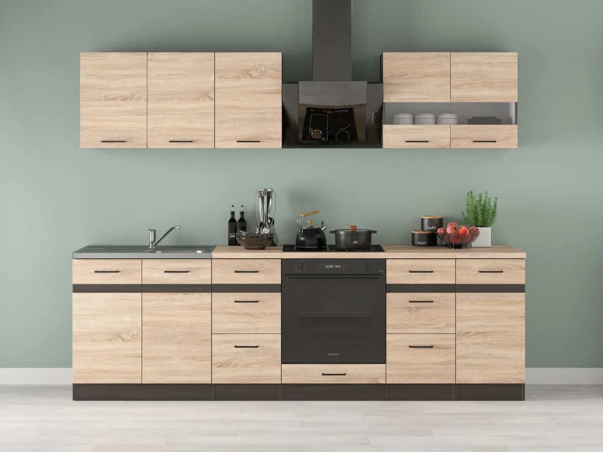 Junona Line 260 см — это набор кухонной мебели, в котором для каждой вещи найдется свое место: от больших кастрюль до любимых специй. Благодаря продуманному сочетанию нижних и верхних шкафов кухня становится пространством, где готовить — одно удовольствие.