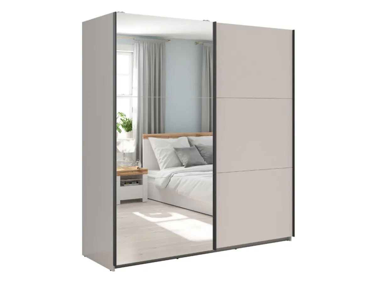 Tetrix сочетает в себе функциональность и эстетику с лаконичным современным дизайном. Одна из раздвижных дверей — зеркальная, что добавляет спальне света и визуально расширяет пространство. Внутренняя отделка в цвете «серый лен» придает шкафу сдержанную элегантность, позволяя ему легко вписаться в любой интерьер.
