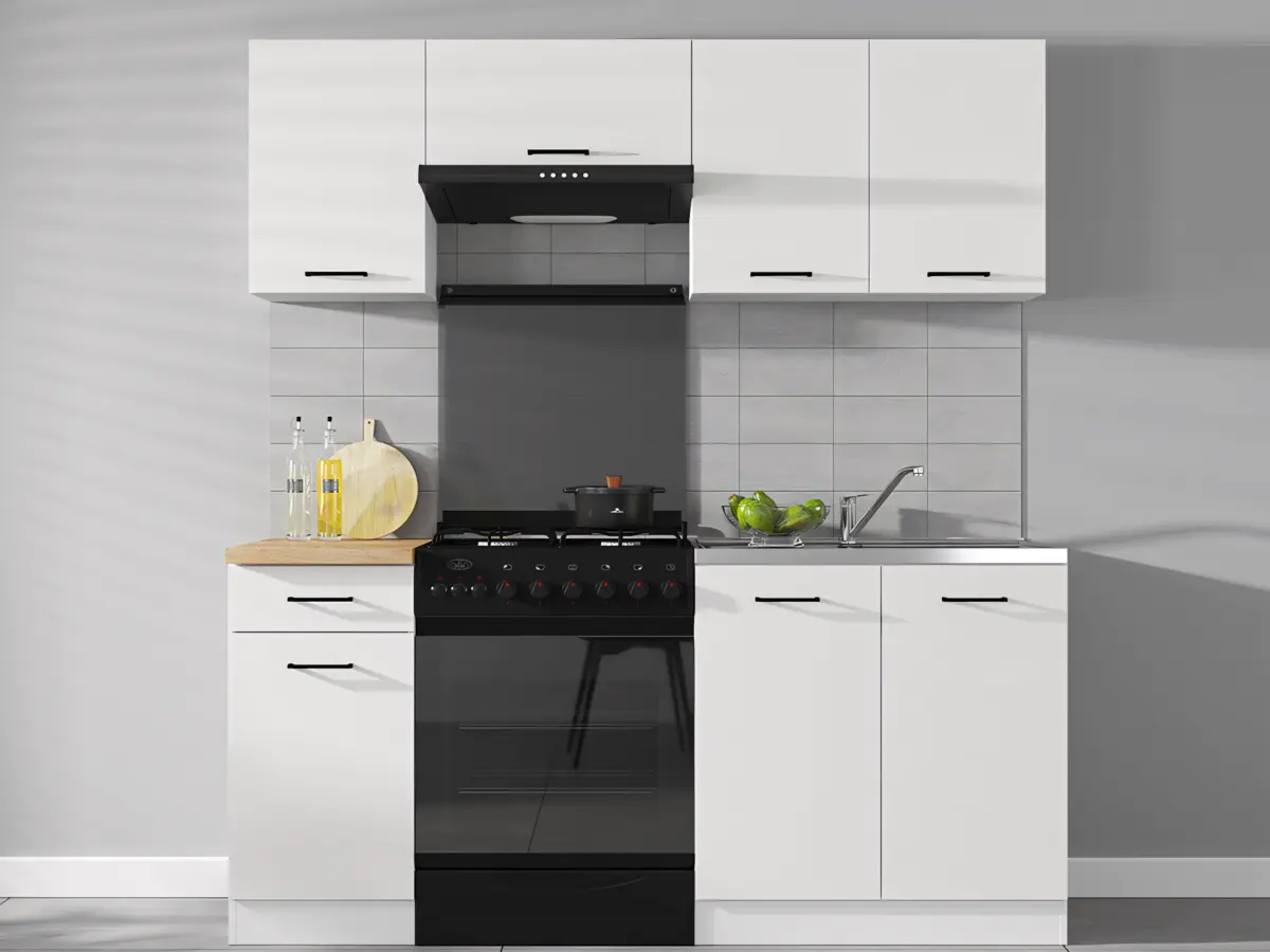 При ширине 180 см комплект позволяет установить вытяжку, отдельно стоящую плиту и двойную мойку. Идеально для компактной зоны, легко дополняется модулями из той же коллекции.