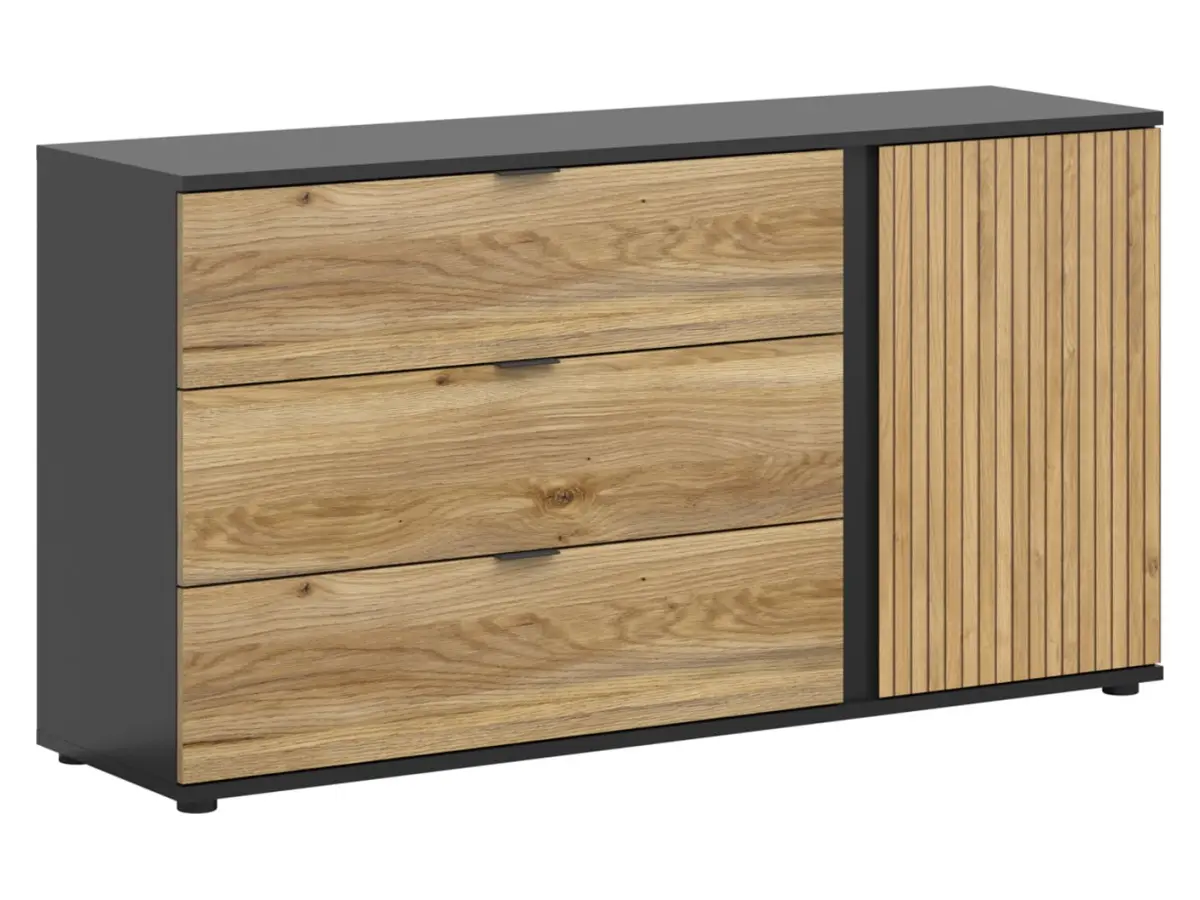 Комод Luen поєднує гладкі фасади шухляд із дверцятами, оздобленими принтованими ламелями, що додає інтер'єру особливої індивідуальності. Оздоблення у кольорі дуб мавелла з чорними деталями ідеально вписується в сучасні інтер'єри у стилі лофт.
