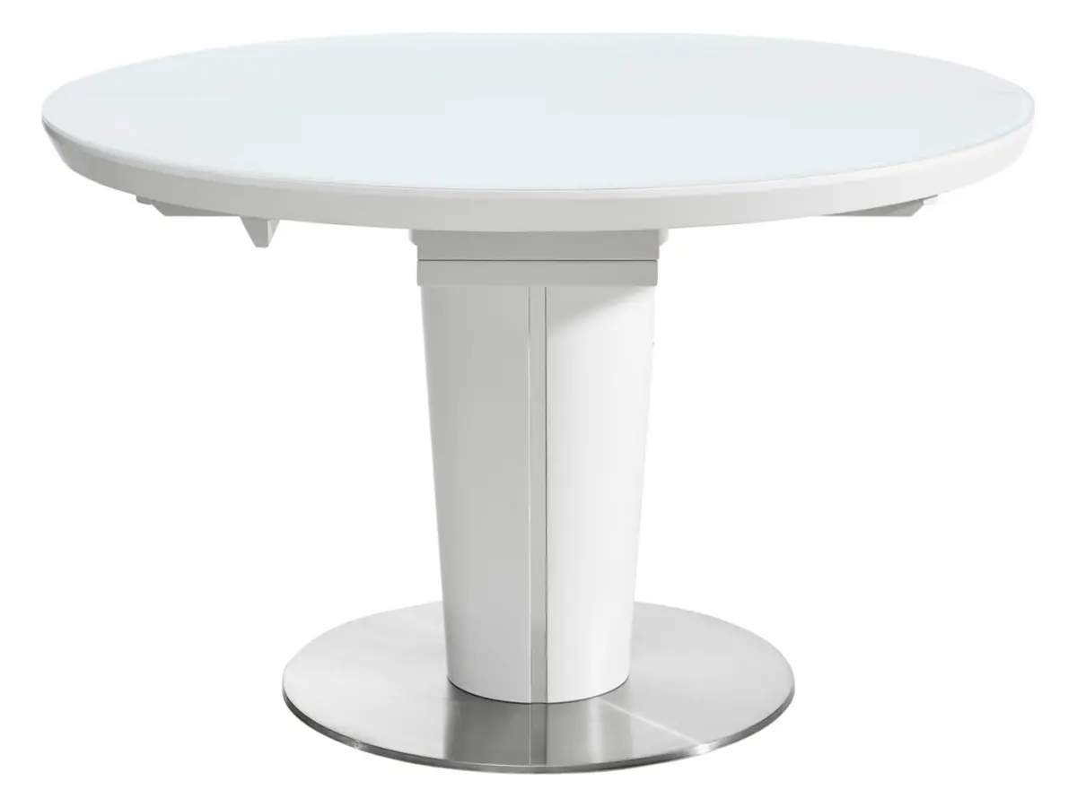 Біла лакована поверхня з МДФ, покрита склом, чудово відбиває світло, завдяки чому будь-яке приміщення здається просторішим і світлішим. Основа з нержавіючої сталі контрастує з білою стільницею, надаючи виробу сучасного характеру з індустріальним відтінком. У результаті ми отримуємо стіл, який виглядає водночас легким і міцним — він стане природним центром вашої їдальні або вітальні.