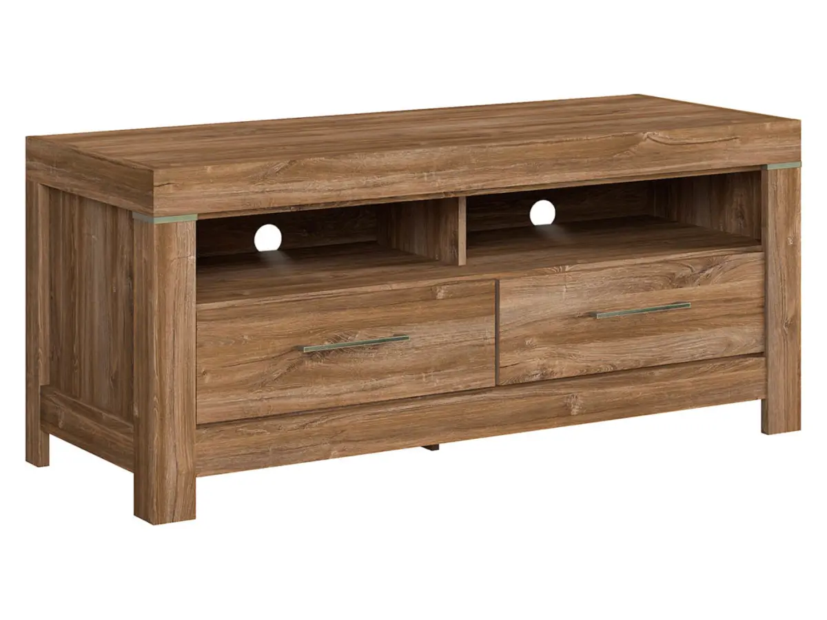 Дві шухляди з плавним ходом і безшумним закриттям вмістять вашу колекцію дисків або інші аксесуари. Відкриті полиці ідеально підходять для програвача чи консолі, а два вентиляційні отвори ззаду дозволяють непомітно провести кабелі — забудьте про хаос із дротів за телевізором.