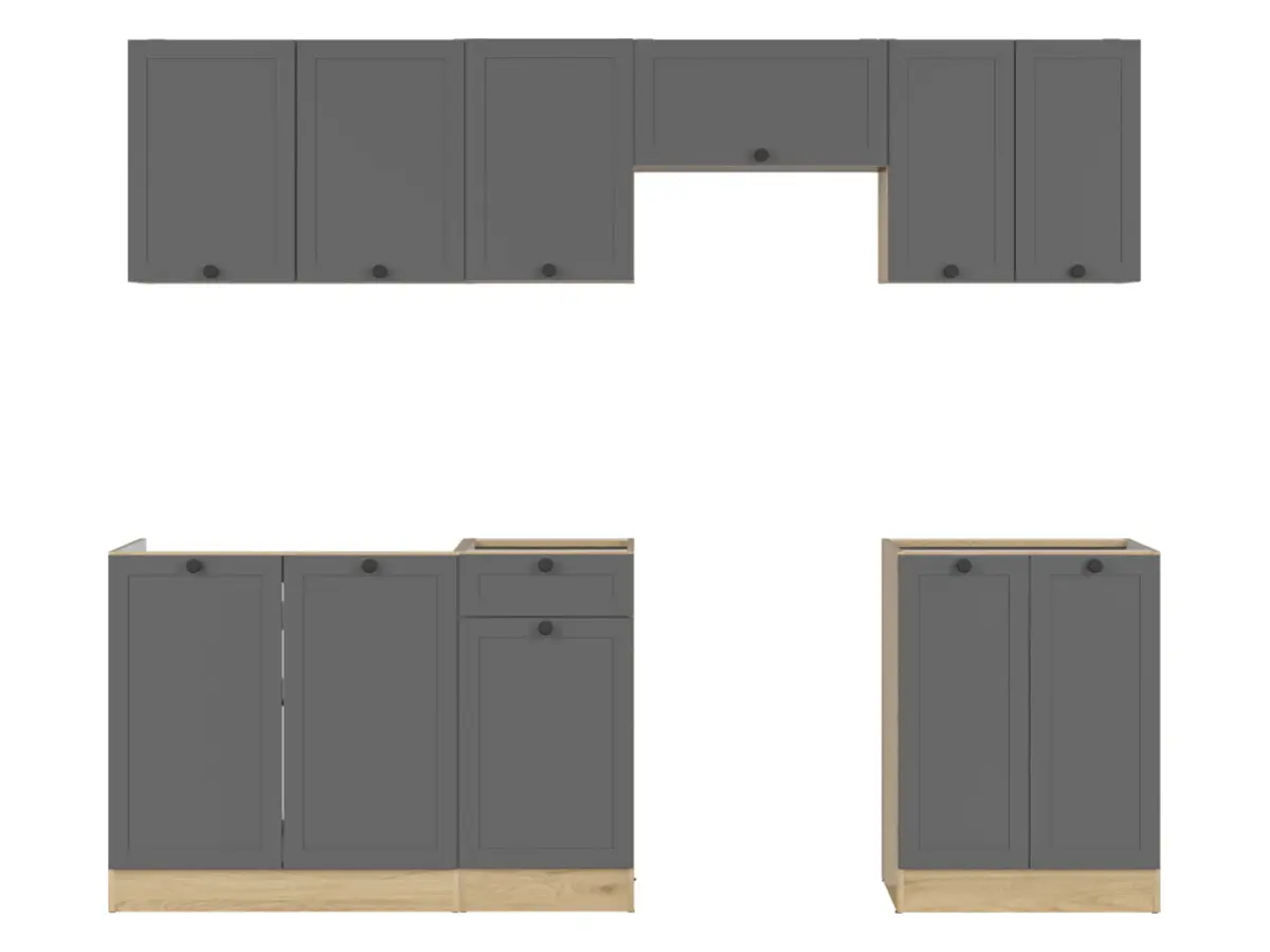 Набір Junona Line 240 має ширину 240 см і включає такі модулі: G2D/60/57, GO/60/30, G1D/40/57-LP, G2D/80/57, D2D/60/82, D1D1S40 та DK2D/80/82. Будь ласка, зверніть увагу, що стільниці та побутова техніка не входять до комплекту і купуються окремо.
